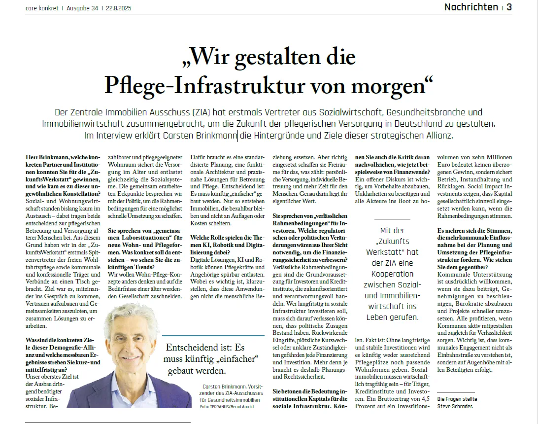 Unter der Leitung von TERRANUS-Aufsichtsrat Carsten Brinkmann hat der Zentrale Immobilien Ausschuss (ZIA) Vertreter aus Sozialwirtschaft, Gesundheitsbranche und Immobilienwirtschaft zu einer strategischen Allianz zusammengebracht. In einem Interview mit care konkret erläutert Carsten Brinkmann die Ziele.