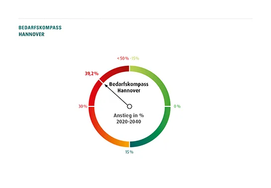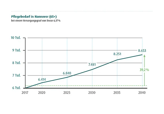 Für Investitionen in Pflegeheime bedeutet dies: Bis 2040 steigt die Bevölkerung der Altersgruppe 65+ von derzeit rund 103.000 auf dann rund 140.000 Menschen. Würden die Niedersachsen in Zukunft den Versorgungsgrad auf 5,5 Prozent absenken, werden bis dahin 23,9 Prozent oder 1.483 zusätzliche Pflegeplätze benötigt – Ersatzbauten für Plätze in veralteten Einrichtungen sind darin noch nicht enthalten. Legt man statistisch – entsprechend der Systematik für die anderen Städte im Bedarfskompass – den aktuell vergleichsweise hohen Versorgungsgrad von 6,17 Prozent zu Grunde, müssten bis dahin gar 39,2 Prozent oder 2.436 zusätzliche Pflegeplätze geschaffen werden.